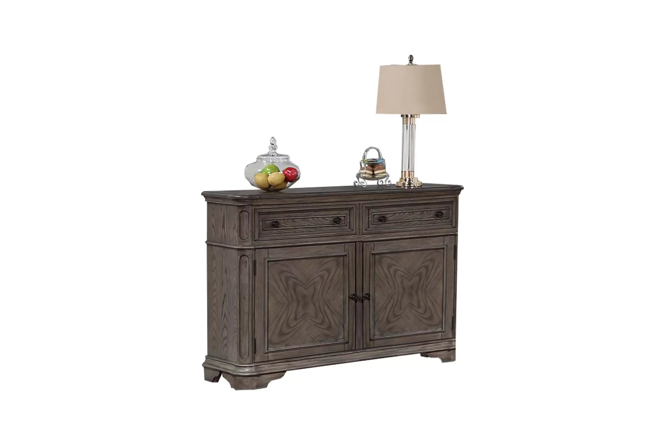 Designed to complement your home with its charming appeal, this server seamlessly blends functionality with rustic elegance. Constructed with meticulous attention to detail, our server features two small drawers, perfect for storing utensils, napkins, or any other dining essentials. Additionally, it boasts a spacious storage compartment at the bottom, offering ample space for larger items such as serving dishes, linens, or even small appliances. Whether placed in your dining room, kitchen, or living area, it serves as a versatile storage solution that enhances the ambiance of any room. Pair this server with our matching table and chairs to complete the look and create a cohesive dining ensemble. Each piece is designed to complement one another, ensuring a harmonious and inviting atmosphere for gatherings with family and friends.